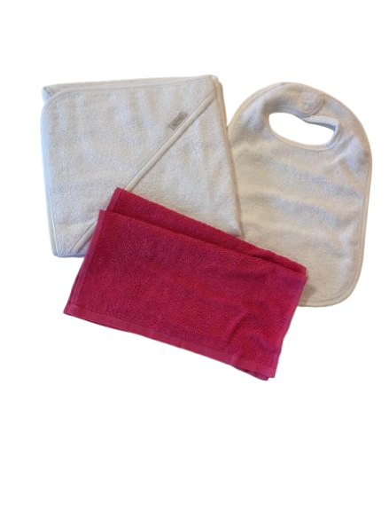 1 badcape, 1 slabbetje en 2 spuugdoekjes overal de naam op borduren.