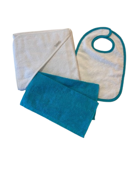 1 badcape, 1 slabbetje en 2 spuugdoekjes overal de naam op borduren.