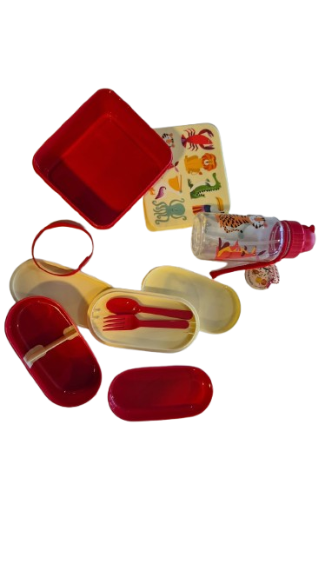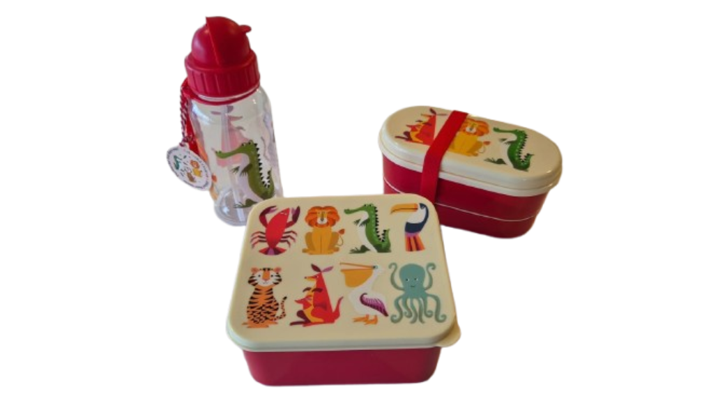 Deze te leuke set ideaal om mee te nemen naar school en om het nog persoonlijker te maken kan je de naam op elk bakje en beker laten bedrukken.